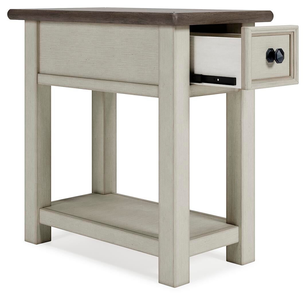 | Details | Made of wood, white oak veneers and engineered wood, Two-tone (weathered gray and antique white) finish, Chairside end table features plank-styled top, Smooth-gliding drawer perfect for holding remotes and more, Integrated 110V power supply with dual USB charging ports, Black faceted hardware, Assembly required | |