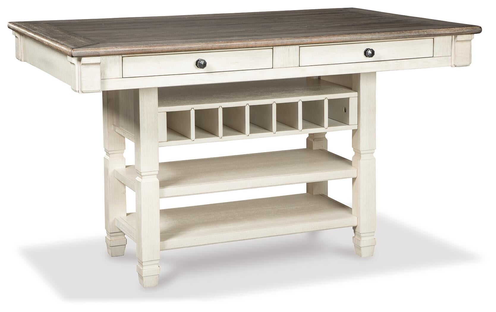 | Details | Made of veneers, wood and engineered wood, Two-tone textural finish; antique white with weathered oak finished top, 4 drawers; 2 each on each side, Storage rack holds up to 7 wine bottles, Seats up to 6, Assembly required | |