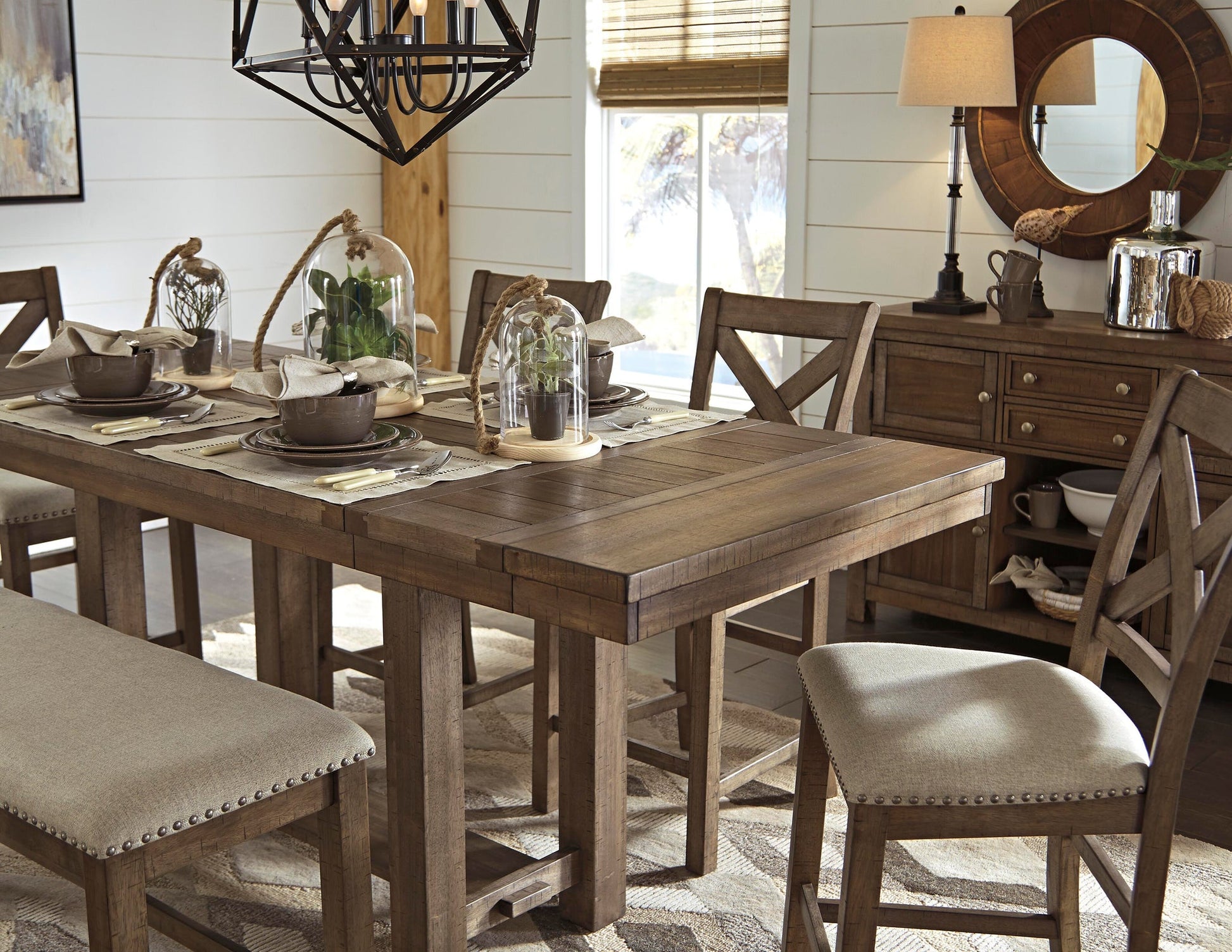 This counter height dining table might be simple at first sight, but a closer look reveals beauty in the details. From the through-tenon pedestal base to the plank-effect table top and distressed nutmeg finish, this table is beaming with charm. Small scale is especially suited to loft-style living, but two optional leaves ensure there’s plenty of space for parties up to eight.