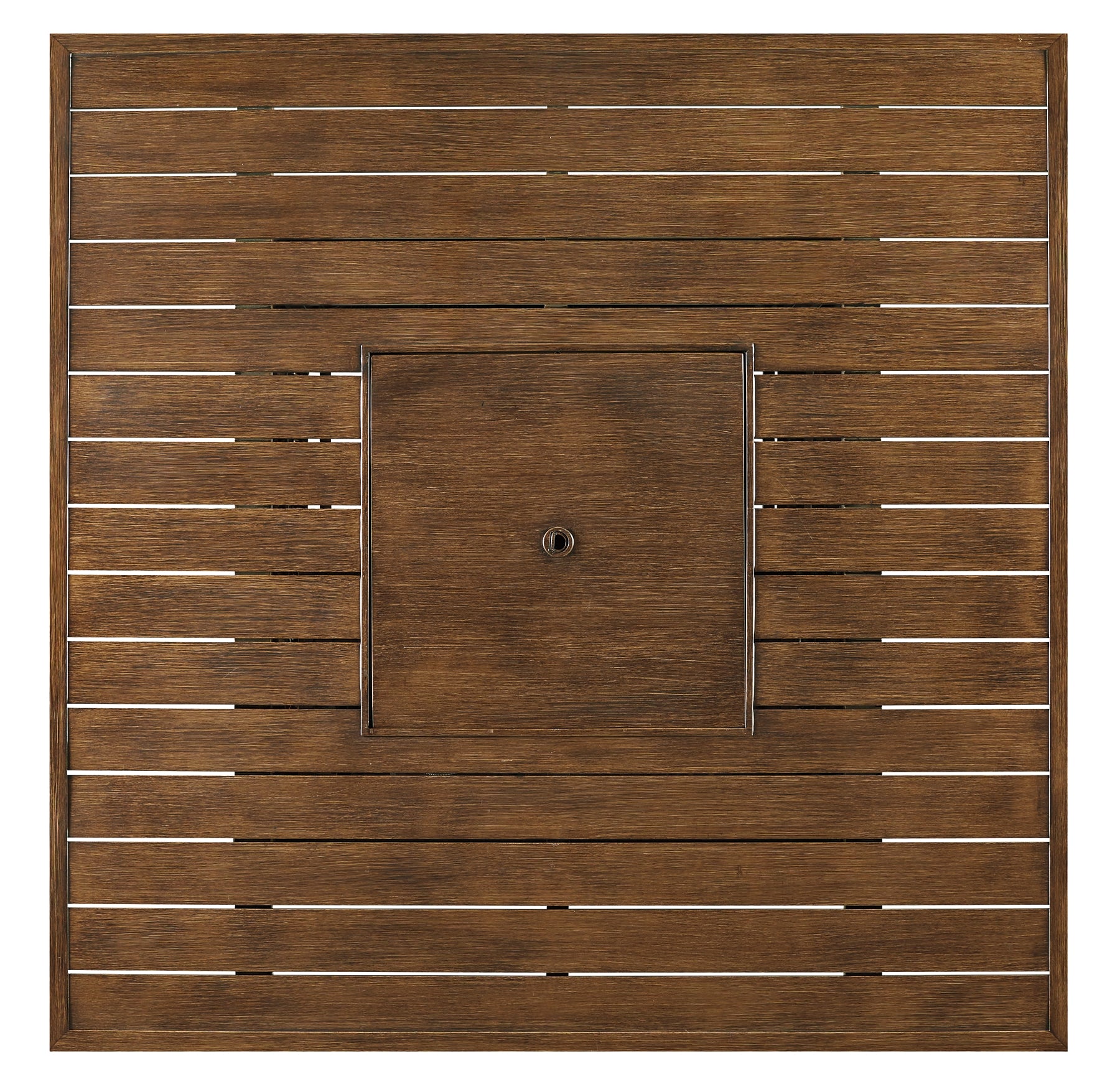 Details | Accommodates up to 8; bar stools sold separately, Door conceals gas propane tank (not included), Rust-proof aluminum frame with wood-look tabletop, Side panels accented with all-weather, handwoven resin wicker, 56" square fire pit table with CSA-approved 55,000 BTU stainless steel burner, glass beads, burner cover and enclosed storage area with shelves, Battery-operated ignition system with adjustable flame control; battery included, Convertible to natural gas, Gas line or propane tank connector hose not provided, Assembly required, Comes with protective weather cover | |