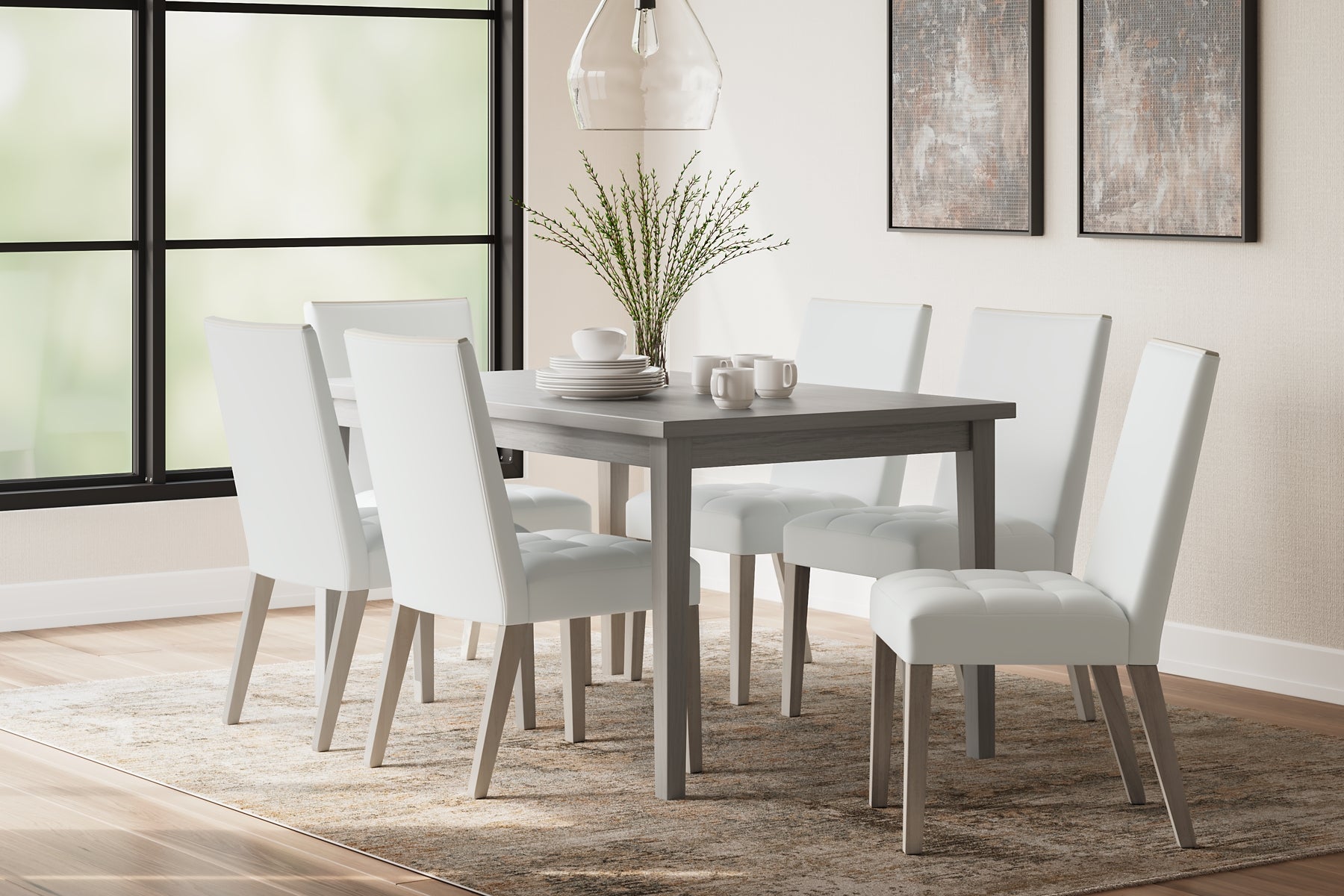 | Details | Made of engineered wood, Tabletop made of melamine with a replicated barn wood effect, MEGA-TUFF® melamine surfaces are made of easy-clean melamine which is heat-, scratch-, water- and stain-resistant, Dining table with tapered legs and a gray finish, Seats up to 6, Assembly required | |