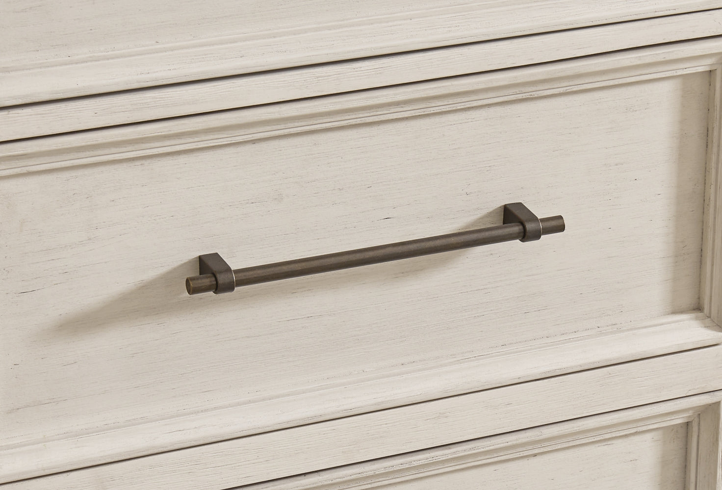 This bedroom set elevates the art of modern farmhouse design. Its two-tone aesthetic blends antiqued white and light grayish brown for added charm. Framed drawer fronts and dark rustic bar pulls lend a country feel. Conveying a feeling of relaxed comfort, this set is sure to carry you away to a dreamy time and place.